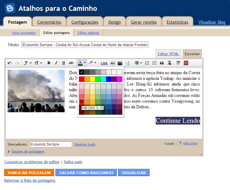 Cada um selecionará os primeiros parágrafos do post original de seu blog, até um número razoável de caracteres e colará no novo post. Não esquecendo dos três pontos ao final do texto. Como dissemos, caso não tenha imagem na postagem original, colocar uma nesta para que mantenhamos um padrão. A imagem sempre à esquerda. Abaixo do texto, pulando uma linha, escreva "Continue Lendo", tamanho grande e o alinhe à direita. A cor do link será esta (clique para ampliar):